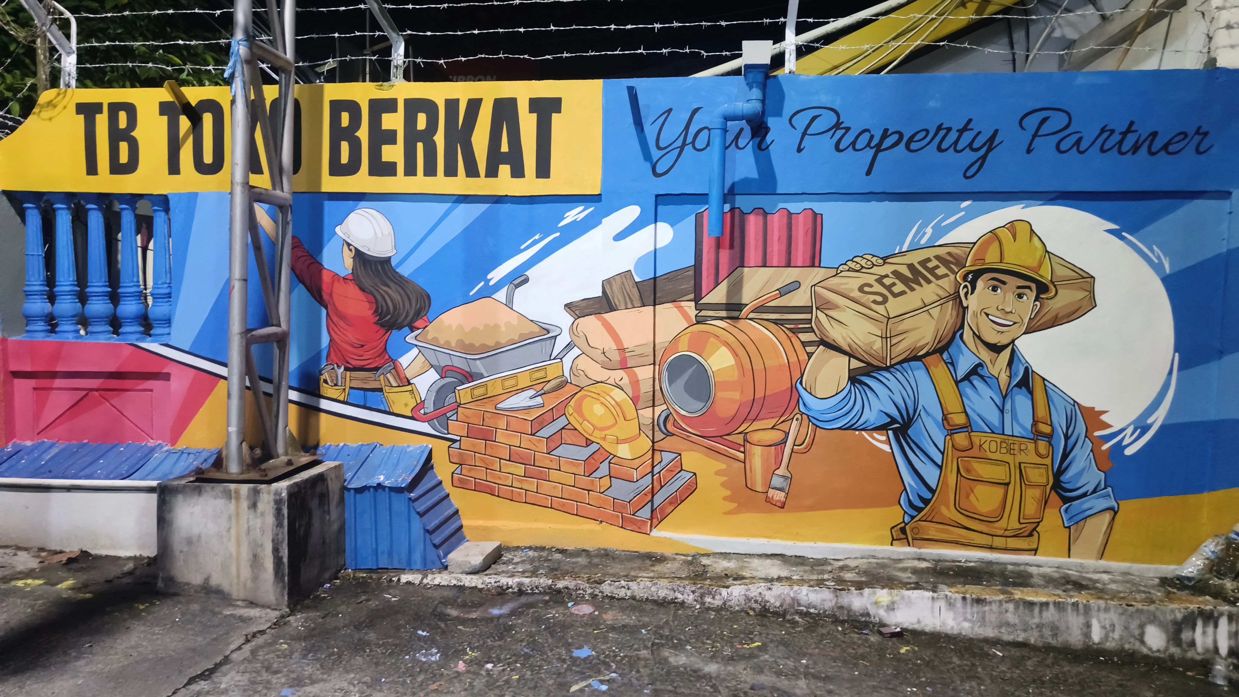 Transformasi dinding eksterior Toko Bangunan (TB) Berkat menggunakan mural ilustratif bertema konstruksi untuk memperkuat identitas brand sebagai "Your Property Partner" secara visual dan menarik perhatian pelanggan.